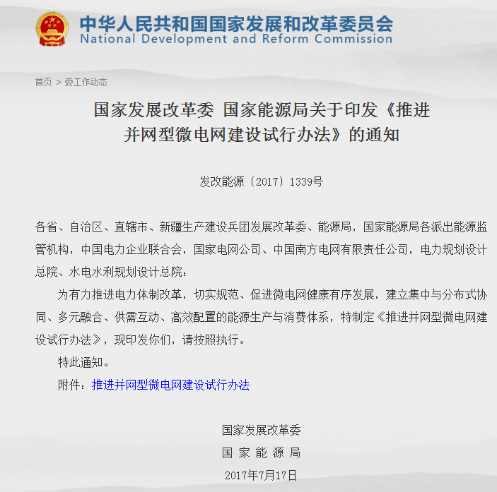 近日國家發(fā)改委、能源局為推進能源供給側結構性改革,促進并規(guī)范微電網健康發(fā)展,引導分布式電源和可再生能源的就地消納,建立多元融合、供需互動、高效配置的能源生產與消費模式,推動清潔低碳、安全高效的現(xiàn)代能源體系建設,結合當前電力體制改革,共同制定了《推進并網型微電網建設試行辦法》。以下為通知及辦法原文:
