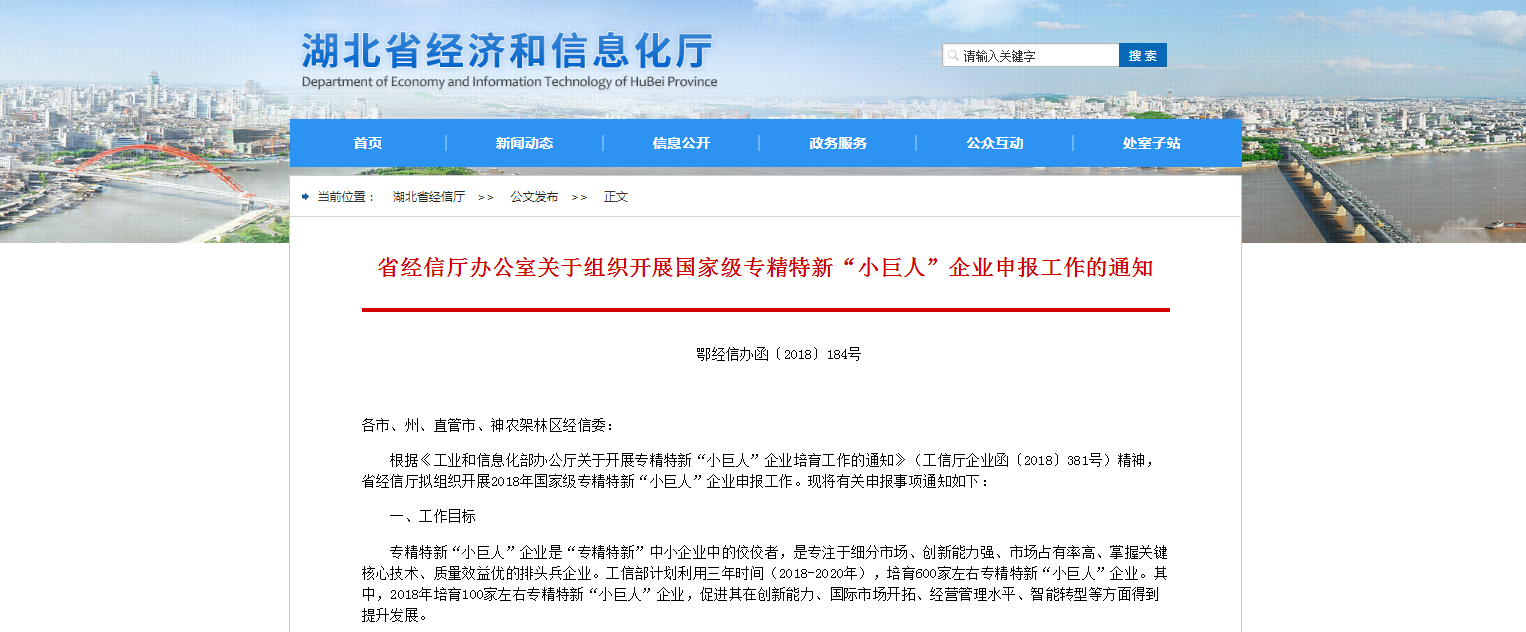 根據(jù)《工業(yè)和信息化部辦公廳關(guān)于開展專精特新“小巨人”企業(yè)培育工作的通知》(工信廳企業(yè)函〔2018〕381號)精神,省經(jīng)信廳擬組織開展2018年國家級專精特新“小巨人”企業(yè)申報工作?,F(xiàn)將有關(guān)申報事項通知如下: