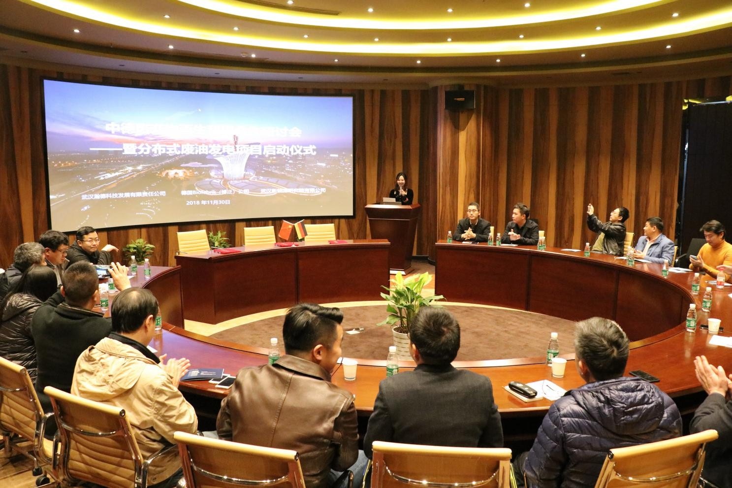本次研討會旨在共同交流新能源產(chǎn)業(yè)在創(chuàng)新設(shè)備的開發(fā)和銷售等方面的機遇與挑戰(zhàn)。會上,與會嘉賓積極提問,奧利弗·里德爾就分布式廢油發(fā)電項目涉及的環(huán)境保護(hù)、設(shè)備標(biāo)準(zhǔn)和知識產(chǎn)權(quán)等話題作了具體介紹和初步探討。最后,湖北省汽車流通協(xié)會常務(wù)副會長羅吉文上臺對會議作出總結(jié)講話,表達(dá)了分布式廢油發(fā)電項目可以應(yīng)用于武漢的許多領(lǐng)域解決廢燃料產(chǎn)生的環(huán)境污染和再生能源等問題,并與德方代表共同展望了新能源再生設(shè)備的未來可持續(xù)方向。