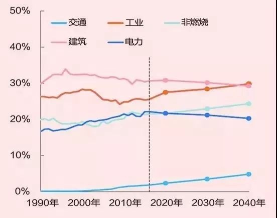 在結(jié)構(gòu)轉(zhuǎn)變過程中,不同領(lǐng)域的能源消費變化同樣顯著。BP、ETRI、IEA都注意到,全球范圍內(nèi)工業(yè)部門能源消費增長在逐漸放緩,建筑是增長最快的部門。工業(yè)部門能源需求在2040年達到峰值,之后保持穩(wěn)定,并且電氣化率還將不斷提高。BP認為,天然氣和電力將滿足未來工業(yè)領(lǐng)域能源增量,2040年成為工業(yè)部門主要能源。