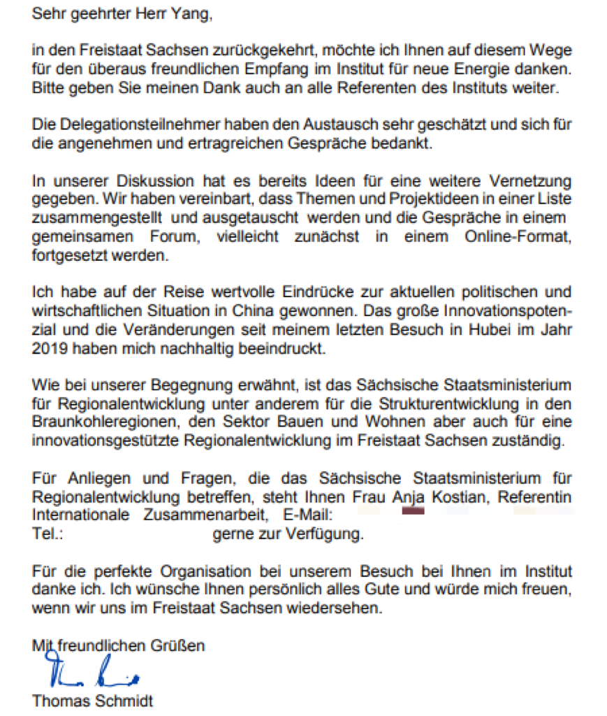 再次感謝我們訪問新能源研究院期間您對會談的圓滿安排。祝您一切順利,并期待在薩克森自由州再次見面。