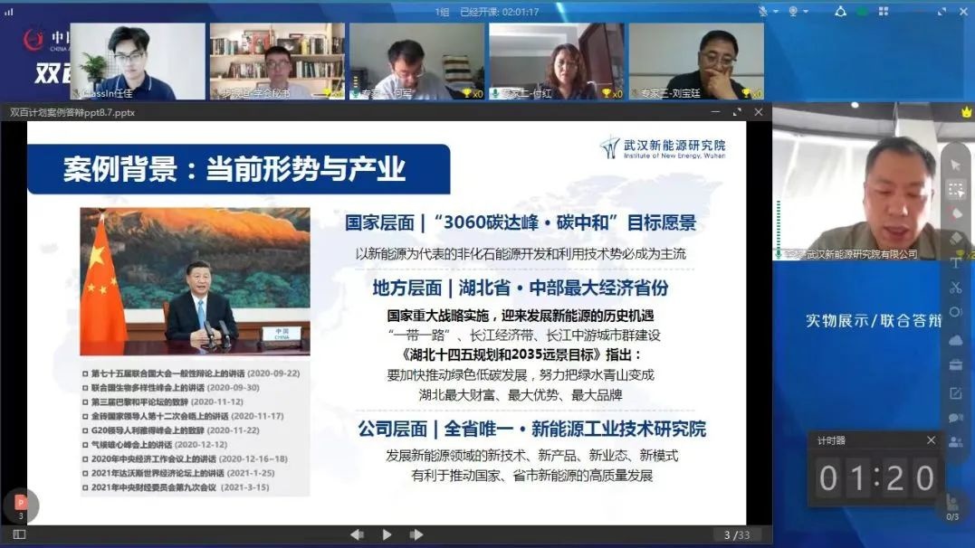 武漢新能源研究院對中國高等教育學(xué)會“雙百計劃”典型案例活動非常重視,申報的“新能源科技成果轉(zhuǎn)化服務(wù)”項目是我院根據(jù)新能源領(lǐng)域不同創(chuàng)新主體的發(fā)展實際,依托新能源科技企業(yè)孵化器、新能源國家專業(yè)化眾創(chuàng)空間、院士專家工作站為代表的國家及省市級創(chuàng)新平臺,廣泛開展雙創(chuàng)工作的總結(jié),收效顯著。因此,“新能源科技成果轉(zhuǎn)化服務(wù)”案例被推薦提名并參加線上答辯會。