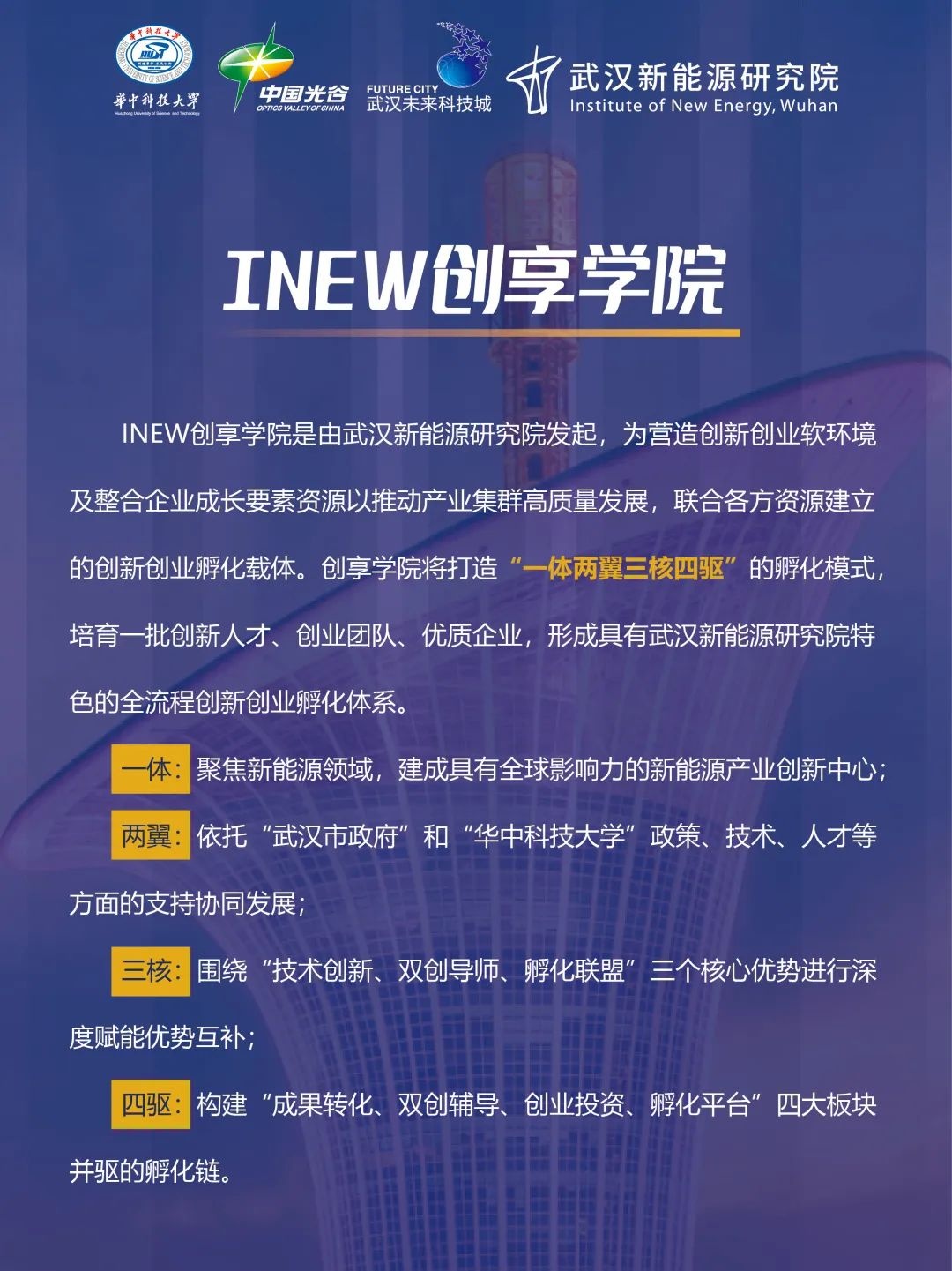 INEW創(chuàng)享學(xué)院是由武漢新能源研究院發(fā)起,為營(yíng)造創(chuàng)新創(chuàng)業(yè)軟環(huán)境及整合企業(yè)成長(zhǎng)要素資源以推動(dòng)產(chǎn)業(yè)集群高質(zhì)量發(fā)展,聯(lián)合各方資源建立的創(chuàng)新創(chuàng)業(yè)孵化載體。創(chuàng)享學(xué)院將打造“一體兩翼三核四驅(qū)”的孵化模式培育一批創(chuàng)新人才、創(chuàng)業(yè)團(tuán)隊(duì)、優(yōu)質(zhì)企業(yè),形成具有武漢新能源研究院特色的全流程創(chuàng)新創(chuàng)業(yè)孵化體系。